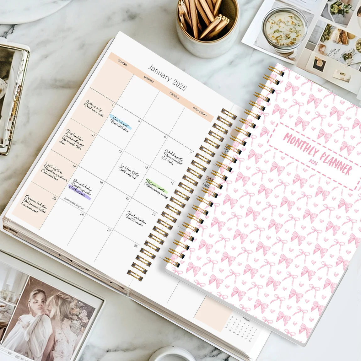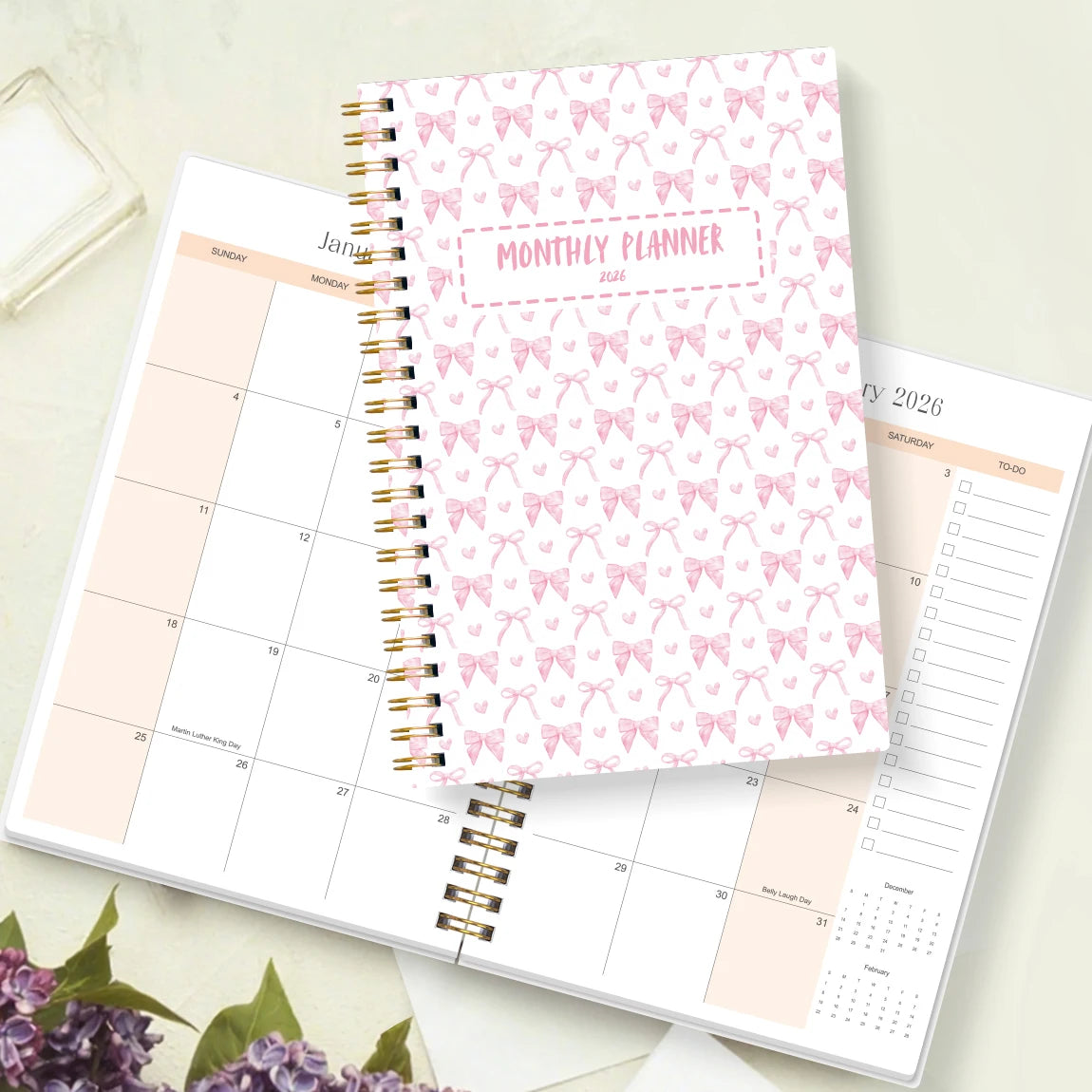The planner features a charming pink bow cover, adding a touch of femininity and elegance to your daily planning.