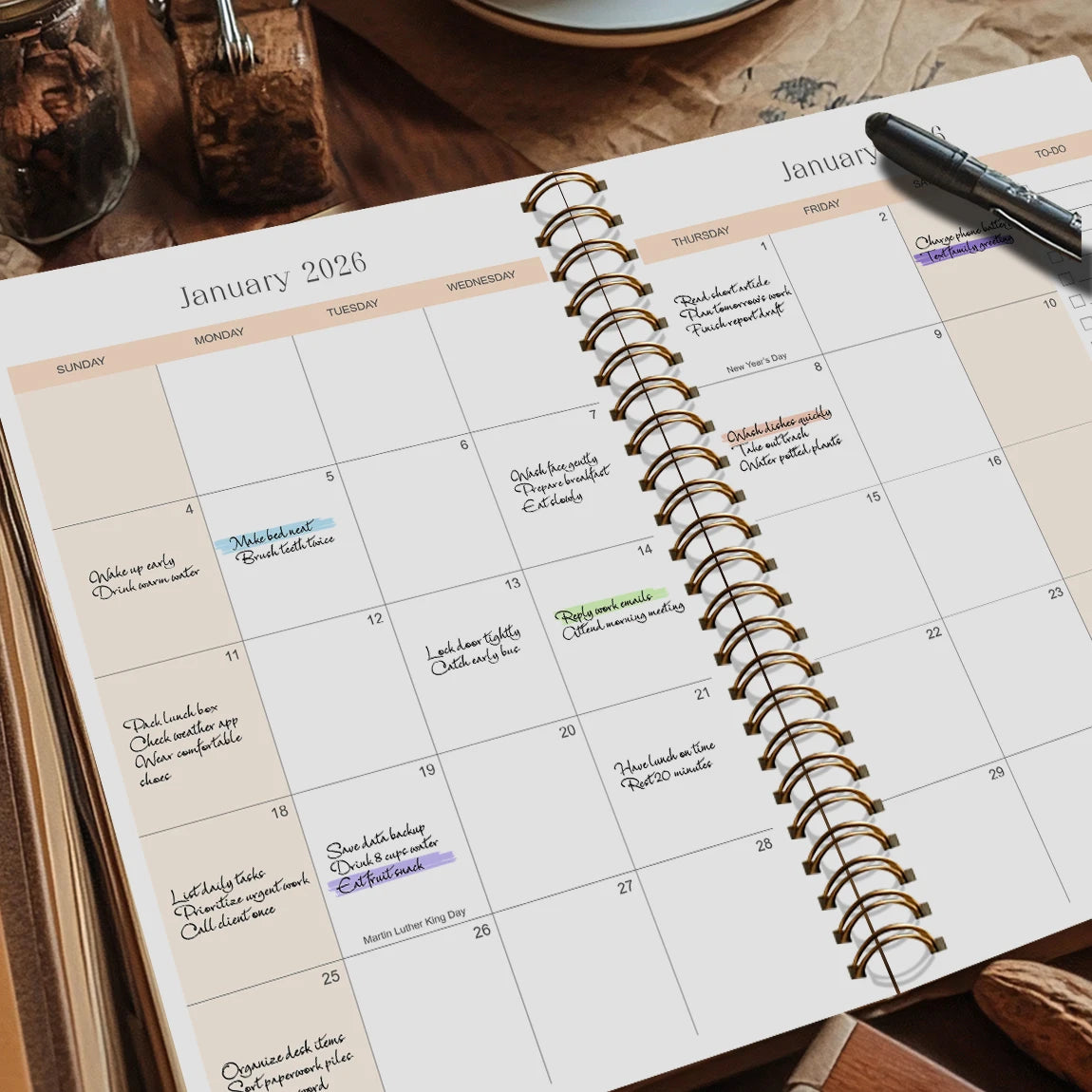The planner includes integrated notes and to-do list sections, helping you keep track of important tasks and ideas.