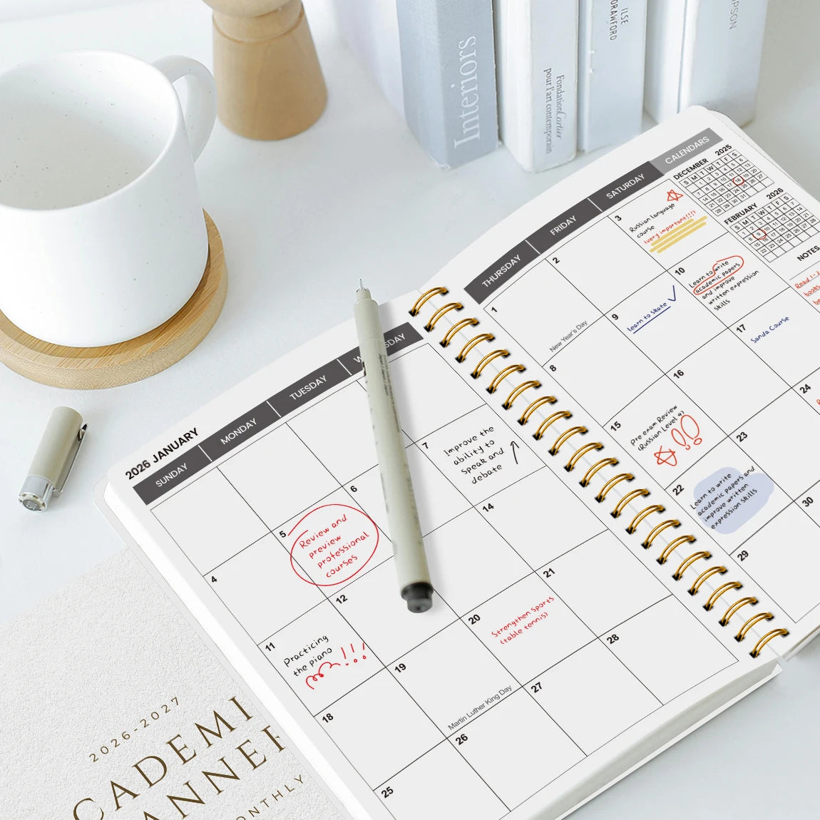 Featuring a weekly and monthly spiral organizer, it offers a comprehensive view of your schedule, aiding in effective time management.