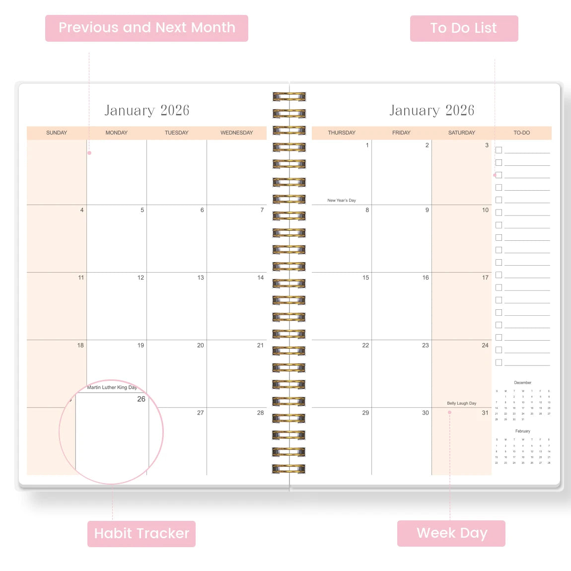 The planner includes integrated notes and to-do list sections, helping you keep track of important tasks and ideas.