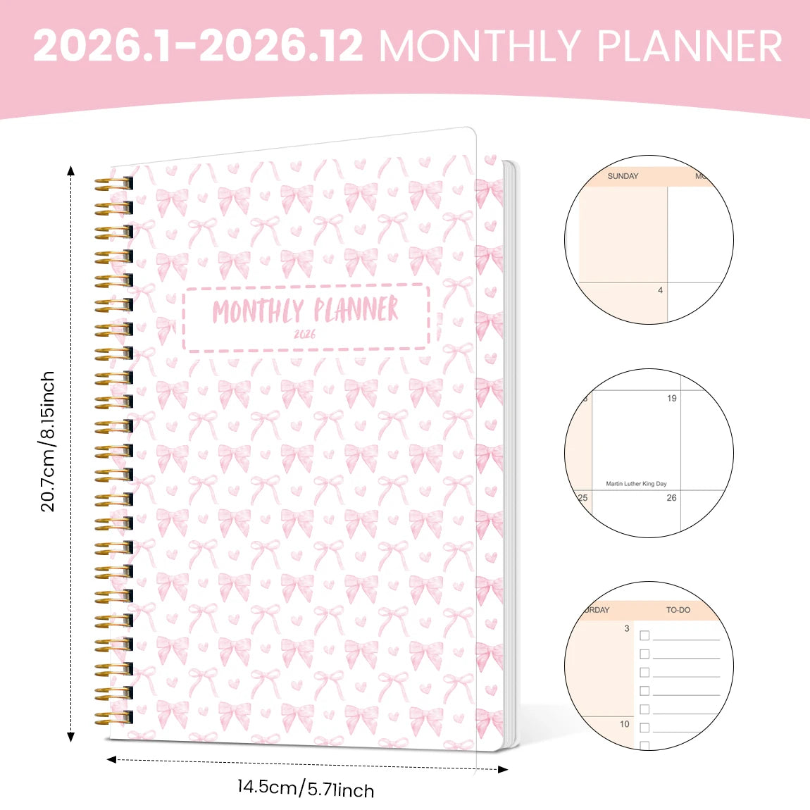 2026 A5 Monthly Planner,Pink Bow Cover,Academic Agenda with Notes&To Do List,Perfect for Productivity,Time Management,Great Gift